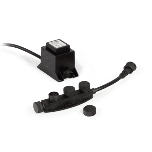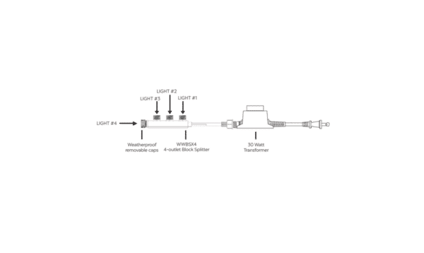Atlantic’s Warm White Wiring Kit powers and connects up to four Warm White Lights. The compact inline 4-outlet Block Splitter simplifies connections and mounts on flat surfaces to neaten and organize wiring. The Splitter features removable weatherproof caps for unused outlets. The 30 watt solid state Transformer is fully weatherproof for worry-free outdoor installations. You can add additional Splitters to power up to 30 watts of Warm White Lighting. The WW30X4 has a 120 volt AC input and a 12 volt AC output. The Transformer includes a 30 Watt Transformer and a 4-outlet Block Splitter with a 1-year warranty.